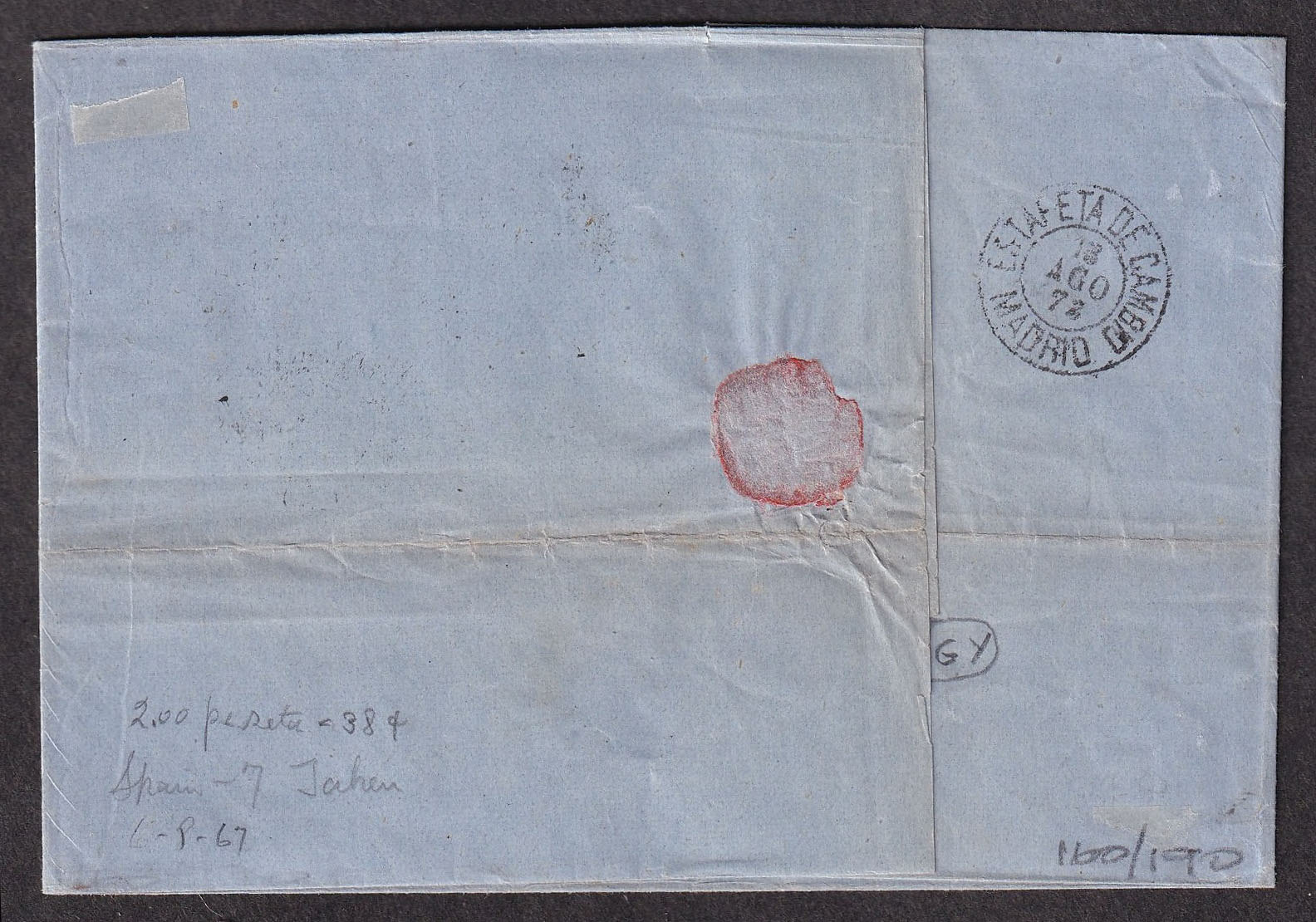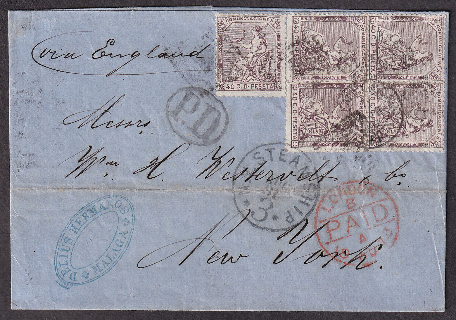 Lot 413 Spain #196 1873 (August 11), folded letter from Málaga to New York, franked with five 40c España definitive issues, tied by four rhombus-shaped small dot obliterators, with “MÁLAGA” double-circle datestamp alongside, red oval “P.D.” and manuscript “via England” route directive on front, Madrid Estafeta de Cambio (13 Aug) double-circle transit on back, red London Paid (18 Aug) single-circle transit, and blue-gray “NY STEAMSHIP 3” (31 Aug) single-circle handstamp on front, indicating 3c postage due, most likely carried on the Calabria of the Cunard Line, which departed Liverpool (19 Aug), Queenstown (20 Aug), and arrived in New York (30 Aug), some creasing, horizontal fold, else a fine transatlantic usage. (Sc. #196 (x5)). Sold for C$180.00 plus 17% buyer’s premium.
