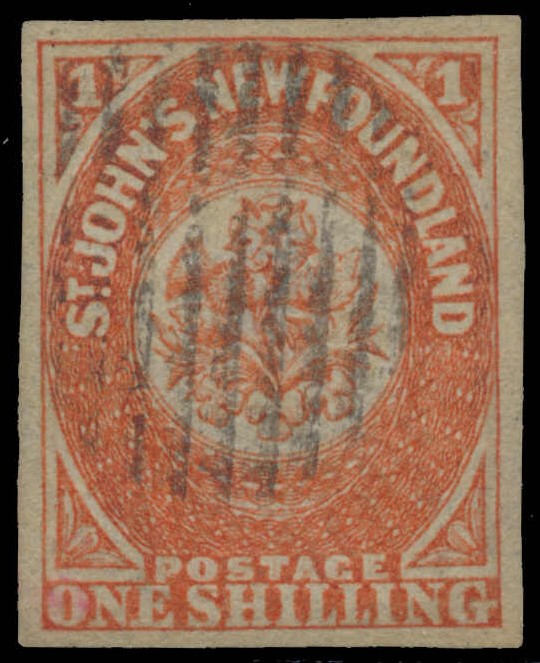 Lot 256 Newfoundland #15 1860, 1sh orange Heraldic, used, with lightly-struck grid cancel, large balanced margins all around, minor thin and trivially oxidized at top, an attractive and very fine appearing example of this key value, of far superior colour than often encountered, and rarely seen with such large margins; with 2001 Greene Foundation certificate. Unitrade CV$15,000.
