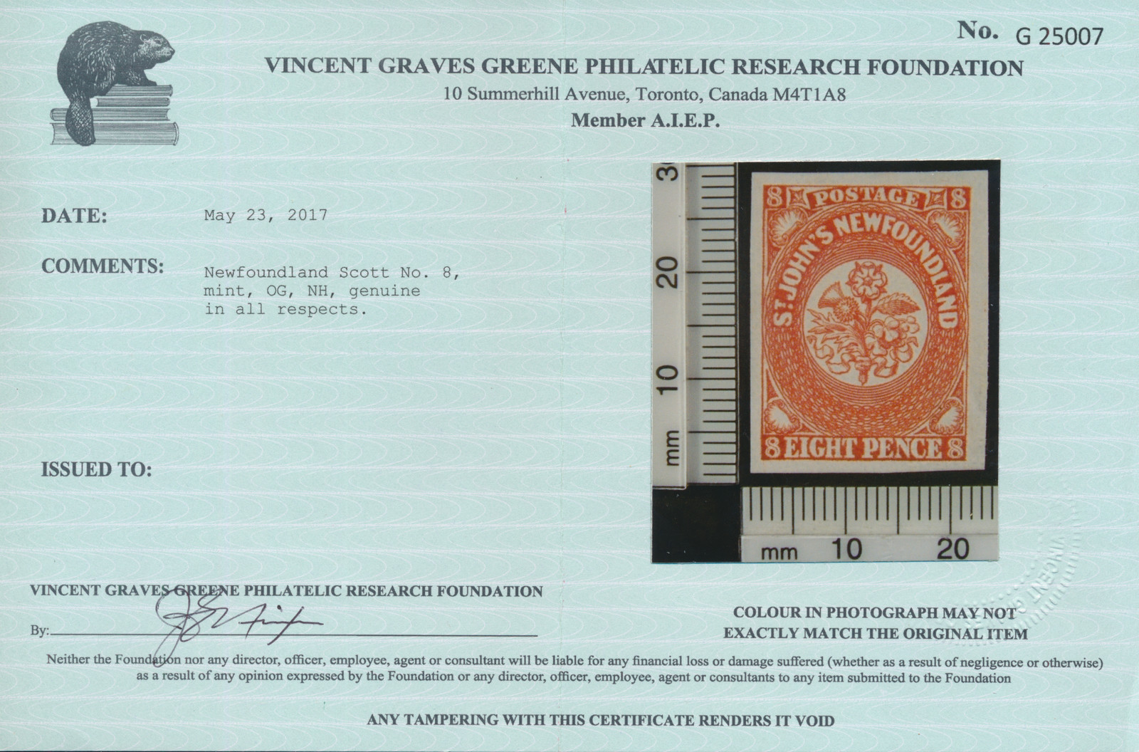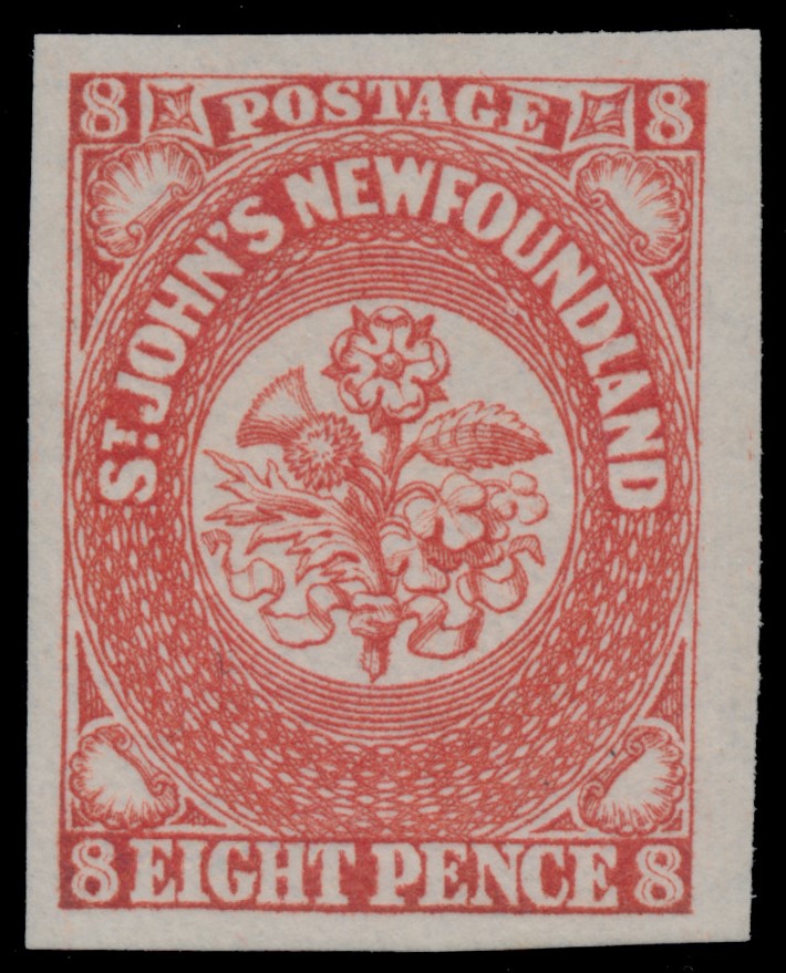 Lot 319 Newfoundland #8 1857, 8d scarlet vermilion Heraldic, never hinged, four large to very large margins, exceptional bright colour and proof-like impression, extremely fine, a beautiful stamp in all respects; with 2017 Greene Foundation certificate. Unitrade CV$1,800.