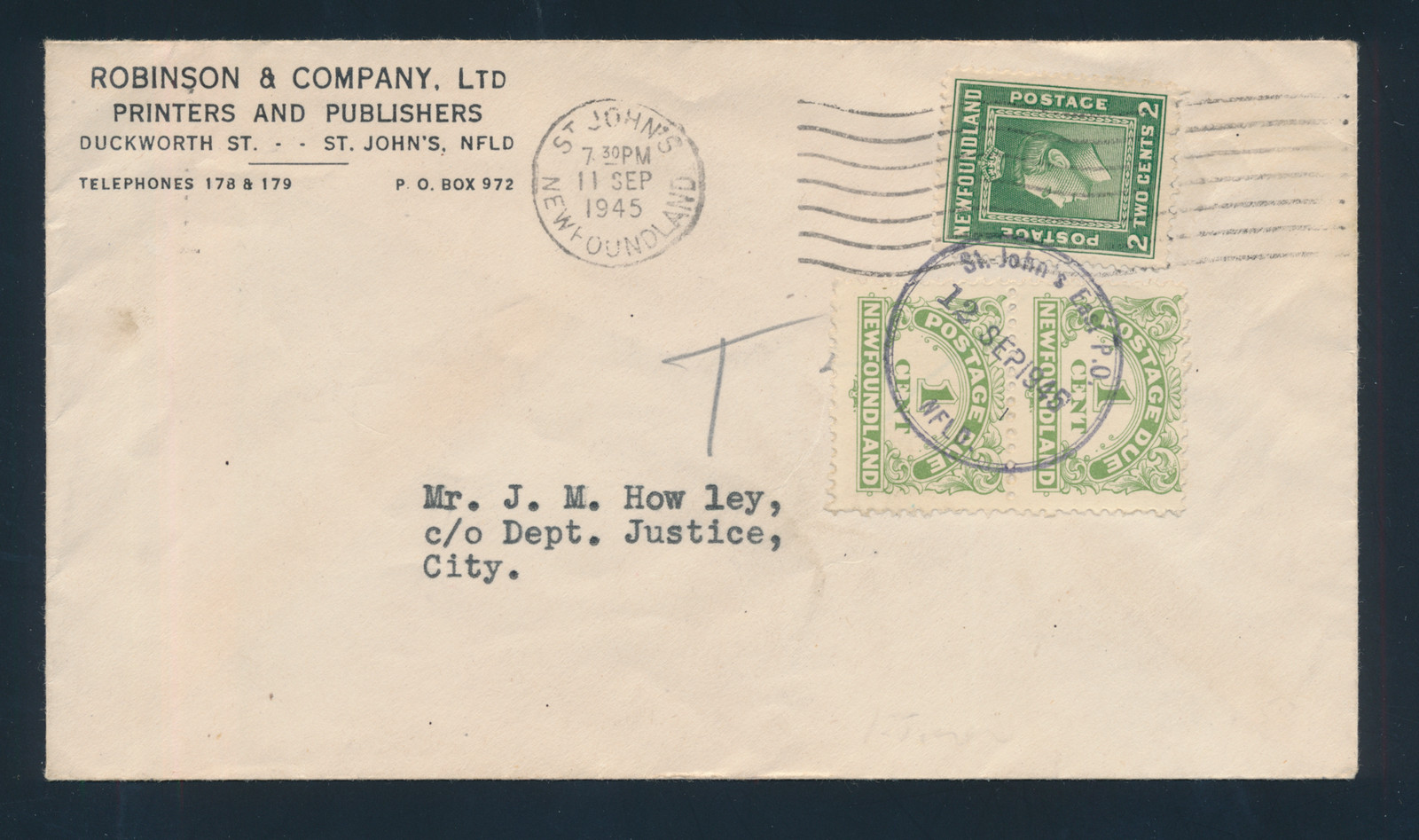 Lot 587 CVR 1945 (September 11), 4c Postage Due on locally-addressed shortpaid cover, franked with 2c green King George VI, tied by St. John’s machine cancel, 1c yellow green Postage Due vertical pair affixed below and cancelled with St. John’s East P.O. c.d.s. (Sep 12), flap unsealed, a fine and scarce usage. Estimate C$100, sold for C$1,000.00 plus 17% buyer’s premium.