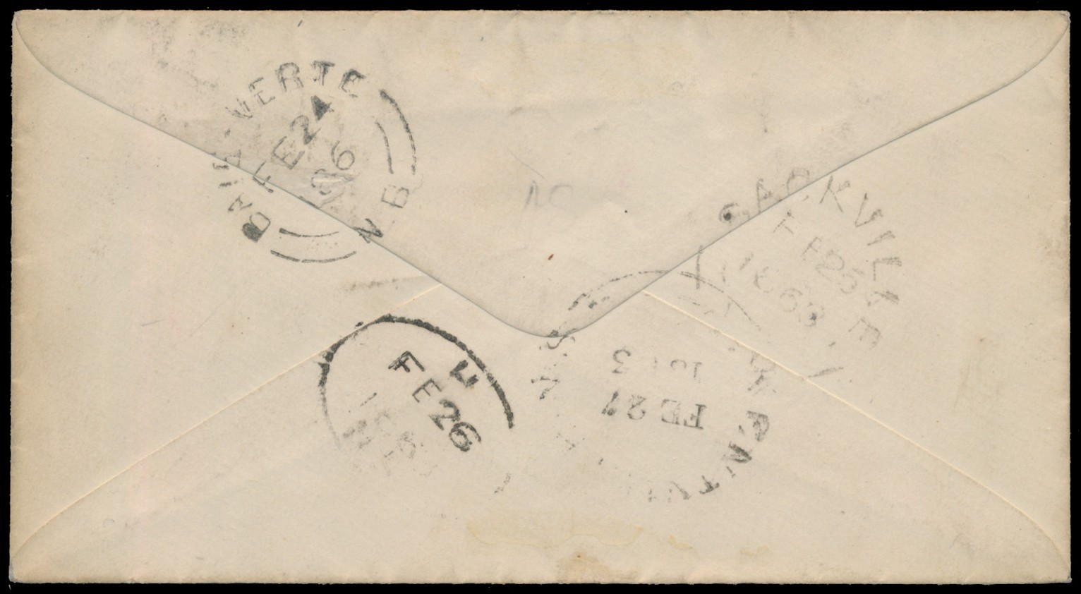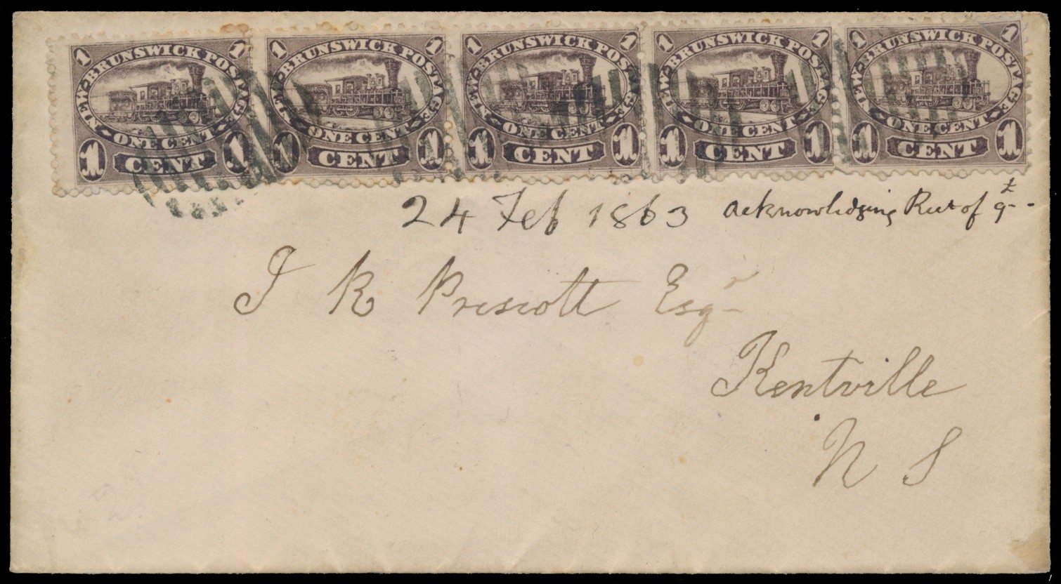 Lot 568 Nova Scotia 1863 (February 24), 1c red lilac strip of four and single, tied by black grid cancel to cover to Kentville, Nova Scotia, reverse with Baie Verte despatch, Sackville transit (25 Feb), next-day oval transit, and Kentville receiver (27 Feb), some trivial soiling to edges, a scarce franking. (Unitrade #6). Estimate C$200, sold for C$500.00 plus 17% buyer’s premium.