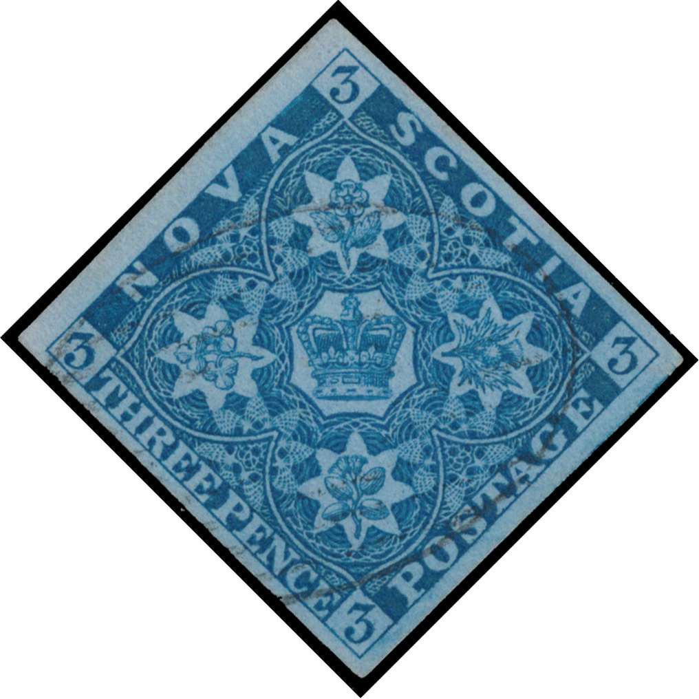 Lot 460 Nova Scotia #2b 1857, 3p pale blue Heraldic, lightly hinged original gum, large margins, strikingly detailed impression and dramatic deep colour, a truly choice example for a collector of exceptional stamps, extremely fine, with 2013 P.F. certificate and photocopy of 2003 Brandon certificate for the pair from which this stamp originates; ex “Fordwater”. Unitrade C$3,200.