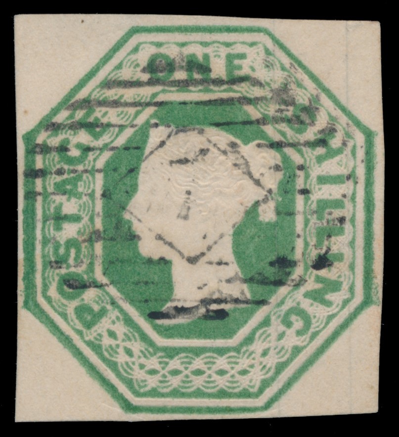 Lot 414 Great Britain #5a 1847, 1sh green Embossed, nicely-centered amidst four ample margins, cancelled with centrally-struck “7” numeral, superior colour to what is often encountered, very fine. Scott CV$1,000.
