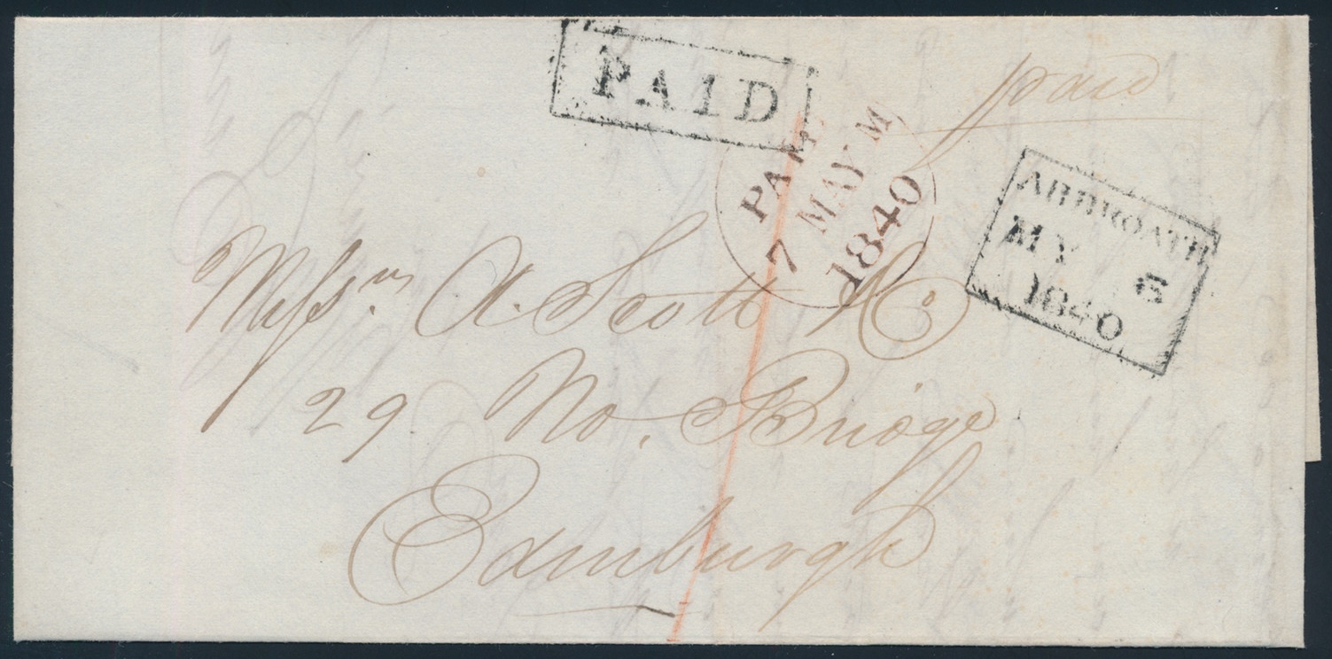 Lot 648, Great Britain 1840 May 6 stampless folded letter, rated “1” and endorsed “Paid”