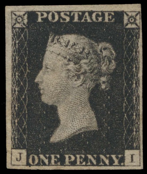 Lot 638 Great Britain #1 1840, 1d black Queen Victoria, Plate 1B, lettered JI, unused, without gum, clear to large margins all around, quite fresh, with characteristic re-entries of this position in the four corner squares, “POSTAGE”, and “ONE P”, a pleasing and scarce unused example, fine; with 2008 Sismondo certificate. (S.G. Spec. AS5b). Scott U$12,500