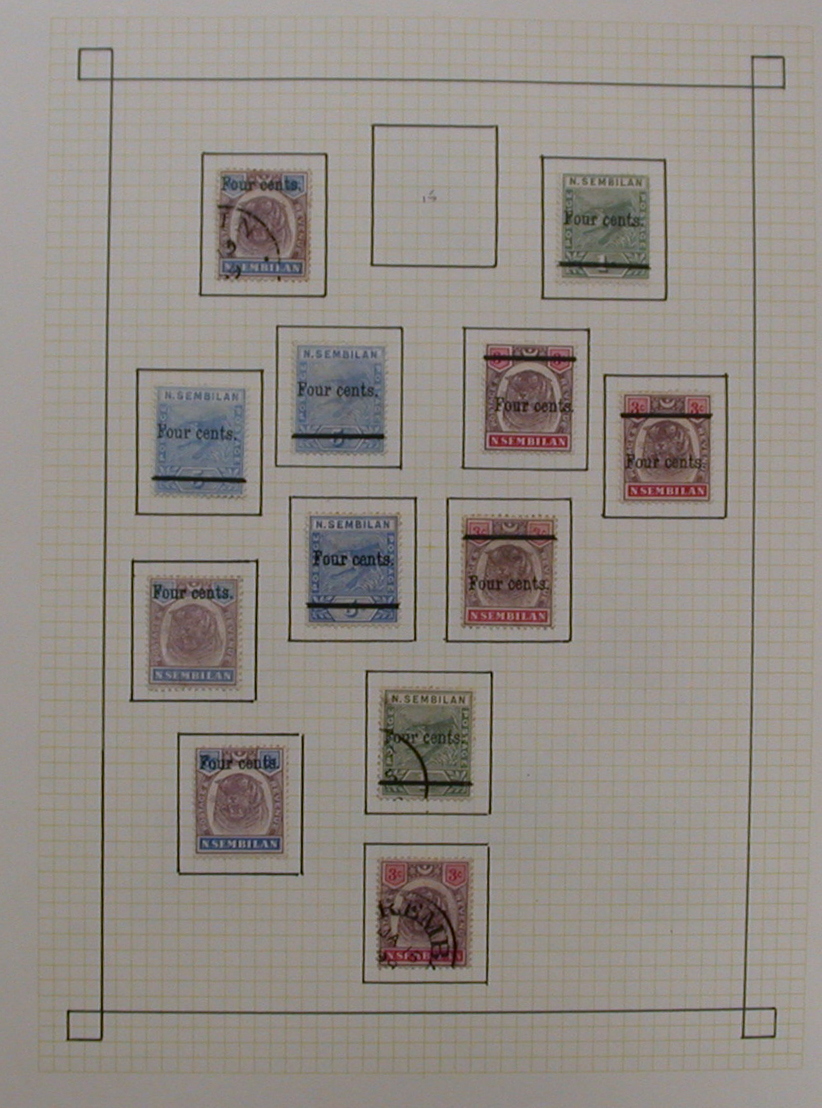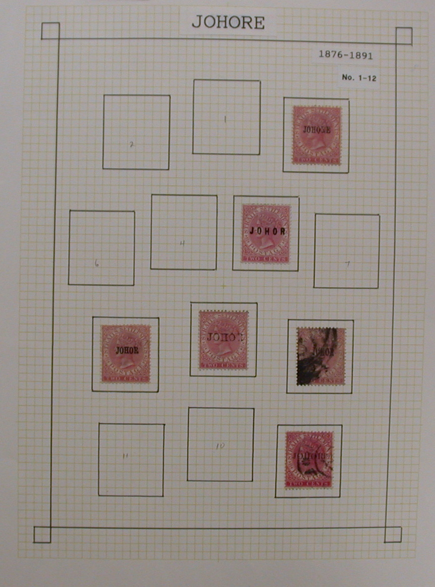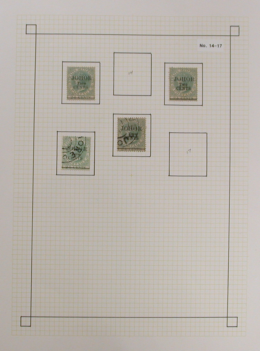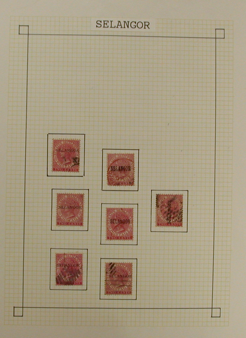 Lot 1796 Lovely Malaya States Specialized Collection on quadrille pages in a binder, with stamps from Johore to Trengganu, mainly all pre-1941. Total catalogue value is high, but there are some faded colours, so examination is recommended. There is duplication, but generally it is to show shades and different cancellations. There are covers scattered throughout. Many stamps cataloguing $100 and the pages with State name overprints from Johore, Sungei Ujong, Perak and Selangor have been scanned. A clean and comprehensive collection, not often seen. (Page 1) (Page 2) (Page 3) (Page 4) (Page 5) (Page 6) (Page 7) (Page 8) (Page 9) (Page 10) (Page 11) .