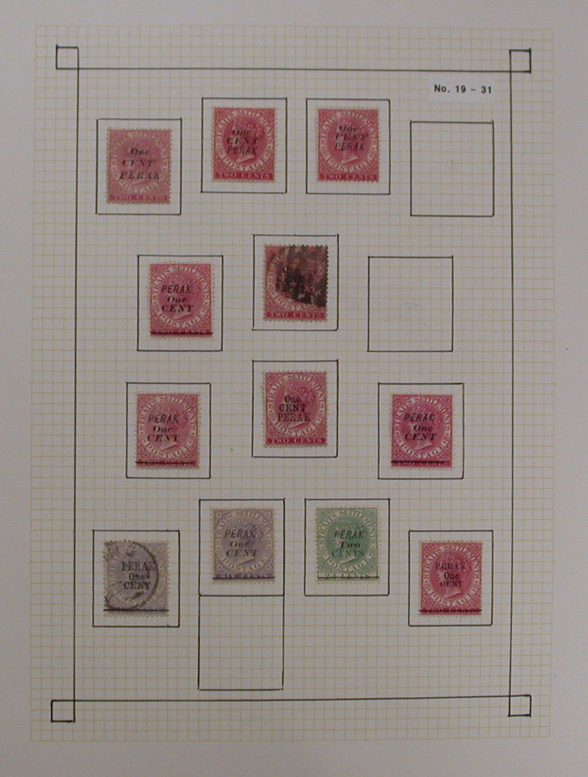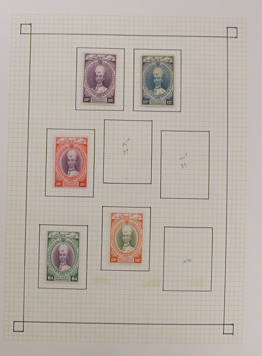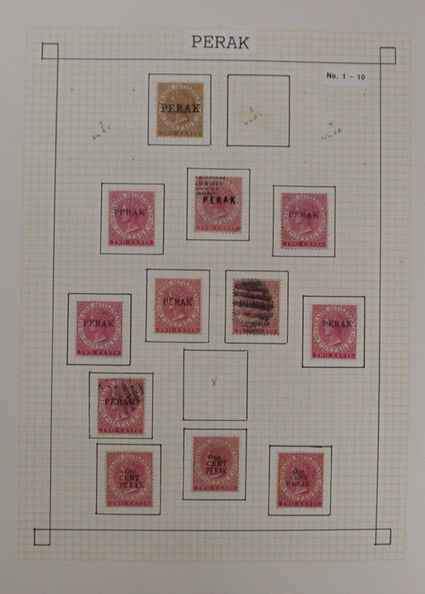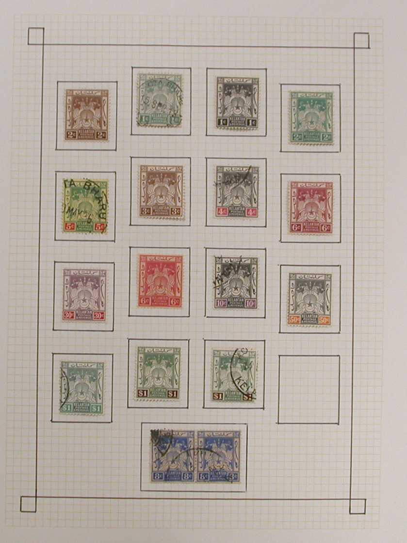 Lot 1796 Lovely Malaya States Specialized Collection on quadrille pages in a binder, with stamps from Johore to Trengganu, mainly all pre-1941. Total catalogue value is high, but there are some faded colours, so examination is recommended. There is duplication, but generally it is to show shades and different cancellations. There are covers scattered throughout. Many stamps cataloguing $100 and the pages with State name overprints from Johore, Sungei Ujong, Perak and Selangor have been scanned. A clean and comprehensive collection, not often seen. (Page 1) (Page 2) (Page 3) (Page 4) (Page 5) (Page 6) (Page 7) (Page 8) (Page 9) (Page 10) (Page 11) .