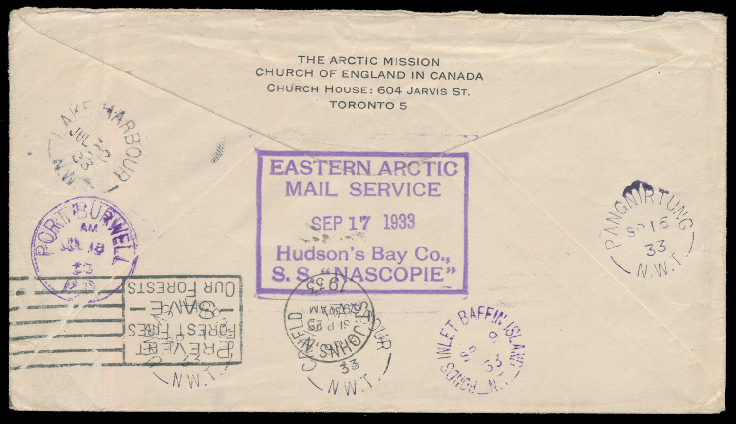 Lot 670 Canada 1933 (September 17), S.S. Nascopie, multiple redirected cover, franked with 5c Postal Union Congress, tied by boxed violet “EASTERN ARCTIC / MAIL SERVICE / Hudsons Bay Co / S.S. “NASCOPIE”” datestamp, to Lake Harbour, Baffin Island, redirected multiple times including to Port Burwell, Dundas Harbour, Craig Harbour, Ponds Inlet, Pangnirtung, and eventually Toronto, with backstamps of all but the last, Port Burwell and Ponds Inlet/Baffin Island in violet, imprint of the Arctic Mission Church of England in Canada on back flap, some light edge creasing, else a fine and desirable Arctic cover. Estimate C$120, sold for C$425.00 plus 17% buyer’s premium.