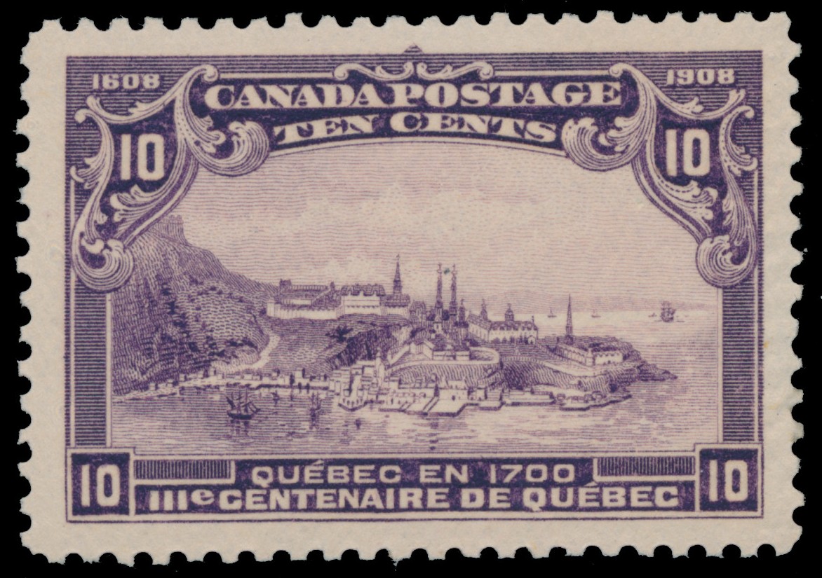 Lot 112 Canada #101 1908 10c violet Québec in 1700, never hinged, nicely-centered amidst large margins, bright colour, very fine; with 2014 Greene Foundation certificate. Unitrade CV$900, sold for C$700.00 plus 17% buyer’s premium.