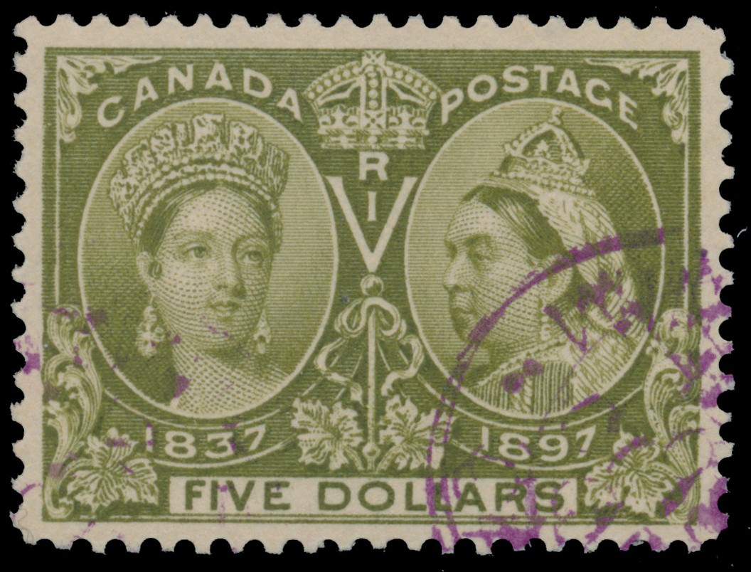 Lot 67 Canada #65 1897 $5 olive green Diamond Jubilee, never hinged, a nicely-centered single of radiant colour, trivial trace of fingerprint on gum, a remarkably fresh and attractive example of this sought-after high-value, scarce and very fine; with 1994 Greene Foundation certificate. Unitrade CV$8,000.