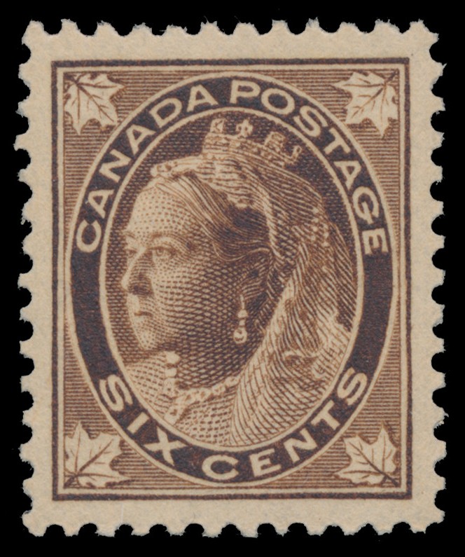 Lot 152 Canada #71 1897 6c Brown Queen Victoria Leaf, mint never hinged and well centered between four jumbo margins, quite fresh and extremely fine. Surely one of the finest known.