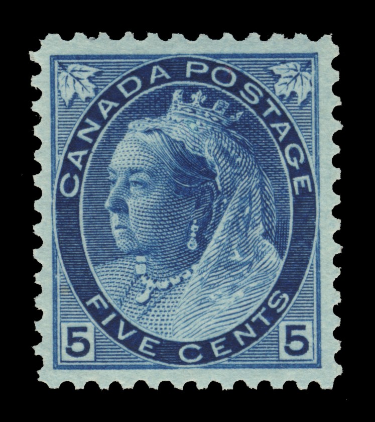 1899 5¢ blue Numeral on bluish paper, an exceptional mint never hinged single with immaculate gum and lovely deep fresh colour. Accompanied by 2008 Richard Gratton AIEP certificate. The 5¢ value is quite difficult to locate in premium quality – this stamp is particularly nice and would likely obtain a lofty grade under the U.S. grading system. Unitrade C$900