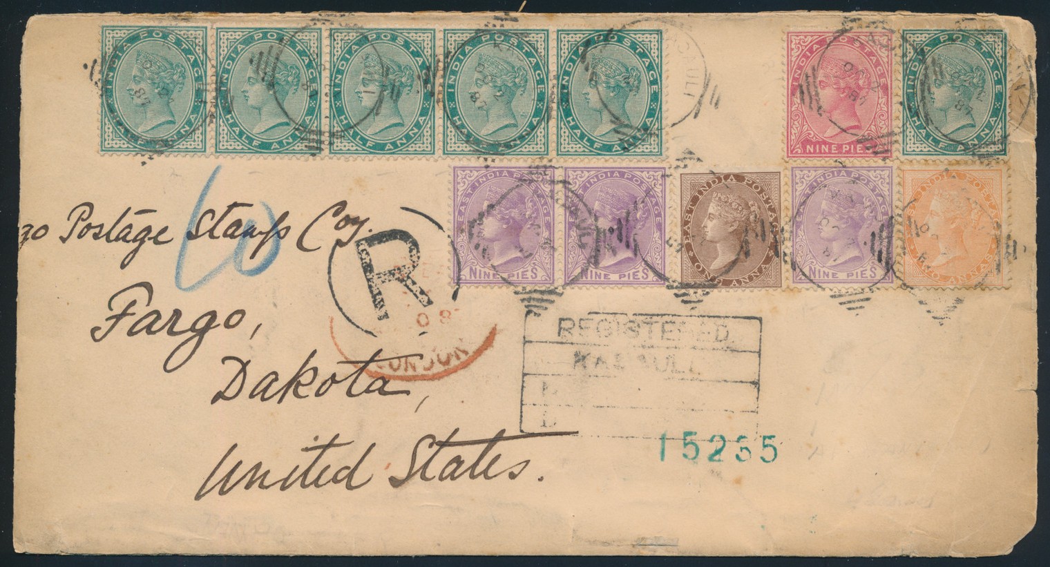 Lot 685, India 1887 multi-colour franking cover, registered from Afghanistan to Fargo, Dakota, sold for C$1,989