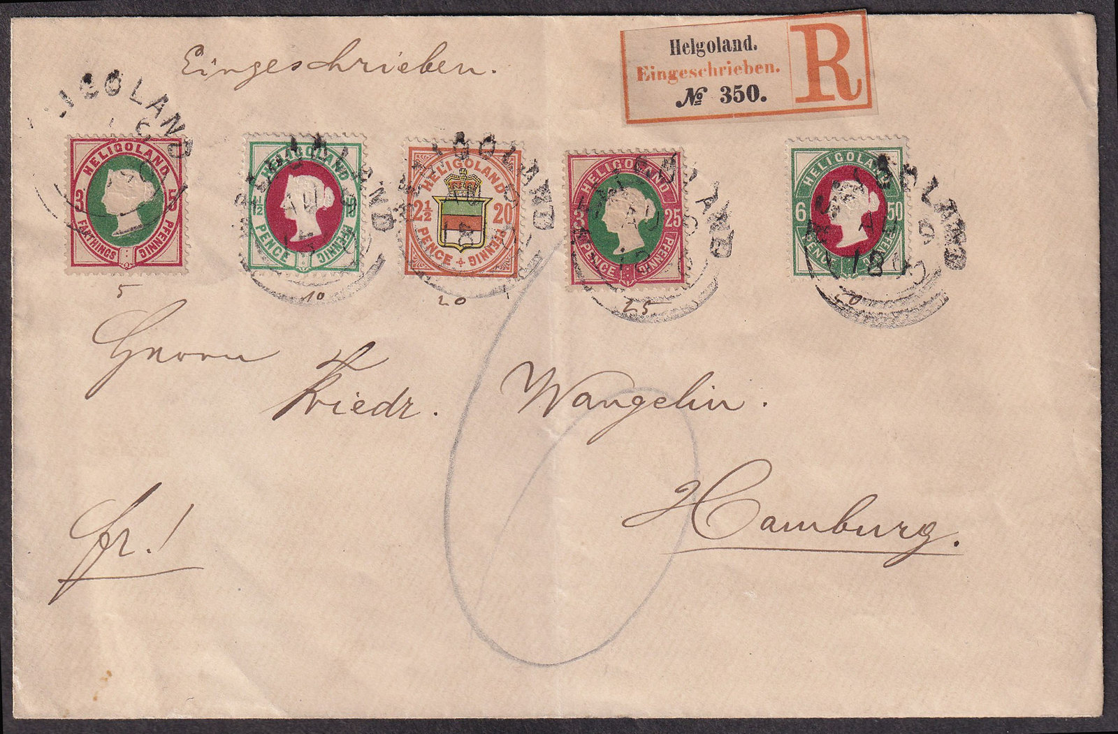 Lot 269 Old German States Heligoland #13-16, 18 1890 (August 9), registered cover to Hamburg, franked with 5Pfg, 10Pfg, 20Pfg, 25Pfg, and 50Pfg bi-currency issues, each tied by “HELIGOLAND” double split-ring datestamps, Hamburg (10 Aug) c.d.s. arrival backstamp, very fine. (Sc. #16/19, 21; Mi. #13/16, 18). Sold for C$275.00 plus 17% buyer’s premium.