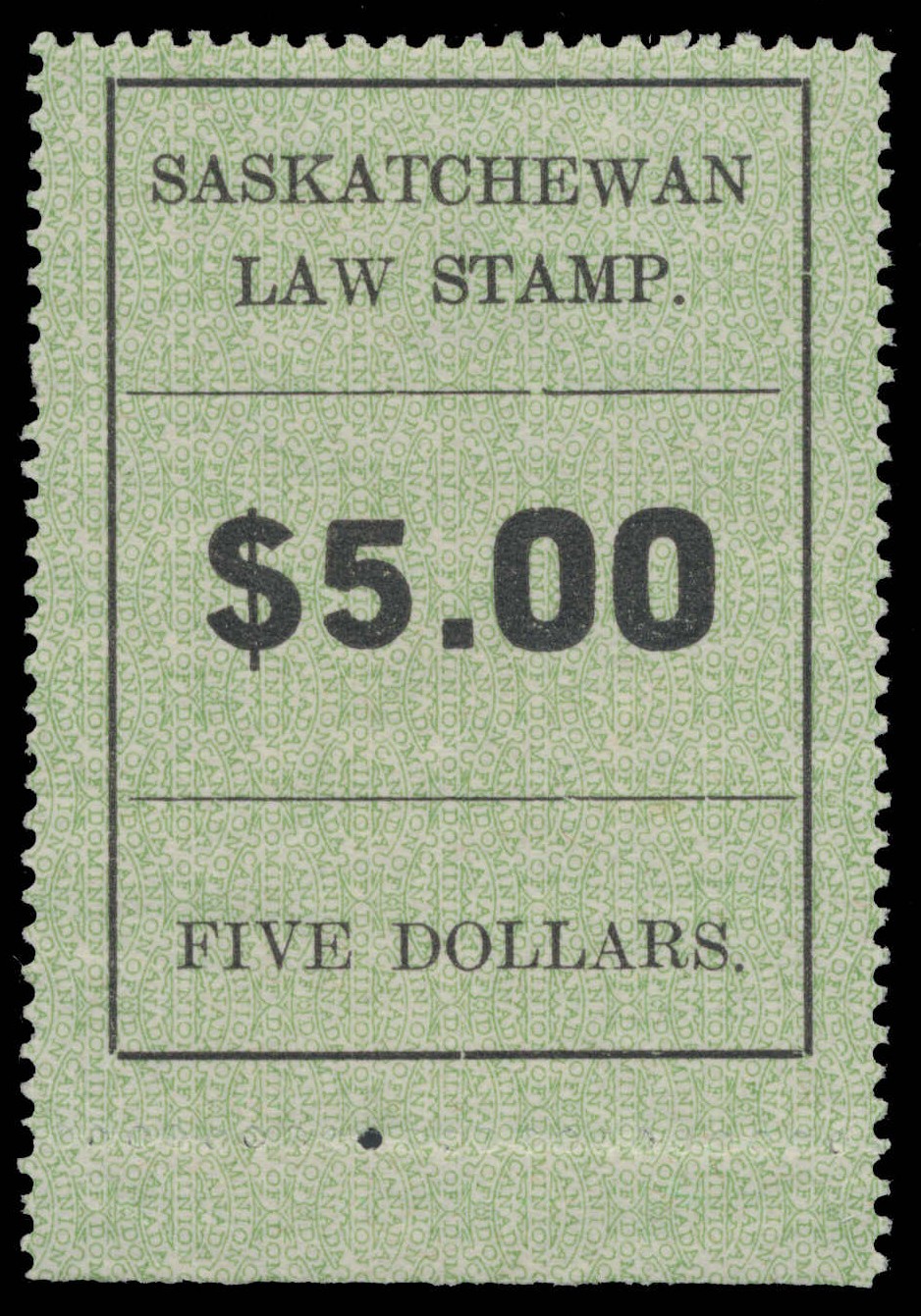 Lot 375 Saskatchewan #SL30 1907, $5 black Saskatchewan Law Stamp with large zeros, from the Second Printing, hinge remnants, fresh colour, a difficult stamp, scarce and fine to very fine. van Dam C$ 650
