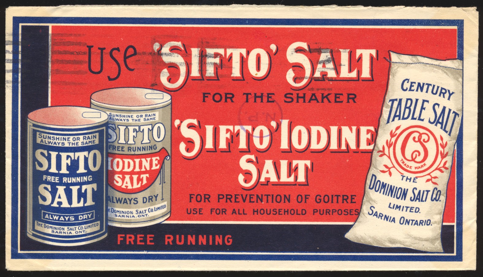 Lot 30 Canada 1925 (October 24), Sifto Salt full-back advertising cover, franked with 3c carmine Admiral, Die II, tied to cover by Saskatoon slogan cancel, superb full-back colour illustrated advertisement for “Sifto” Iodine Salt, for household purposes and “for prevention of goitre”, the odd trivial wrinkle, lovely and very fine. Estimate C$60-80.