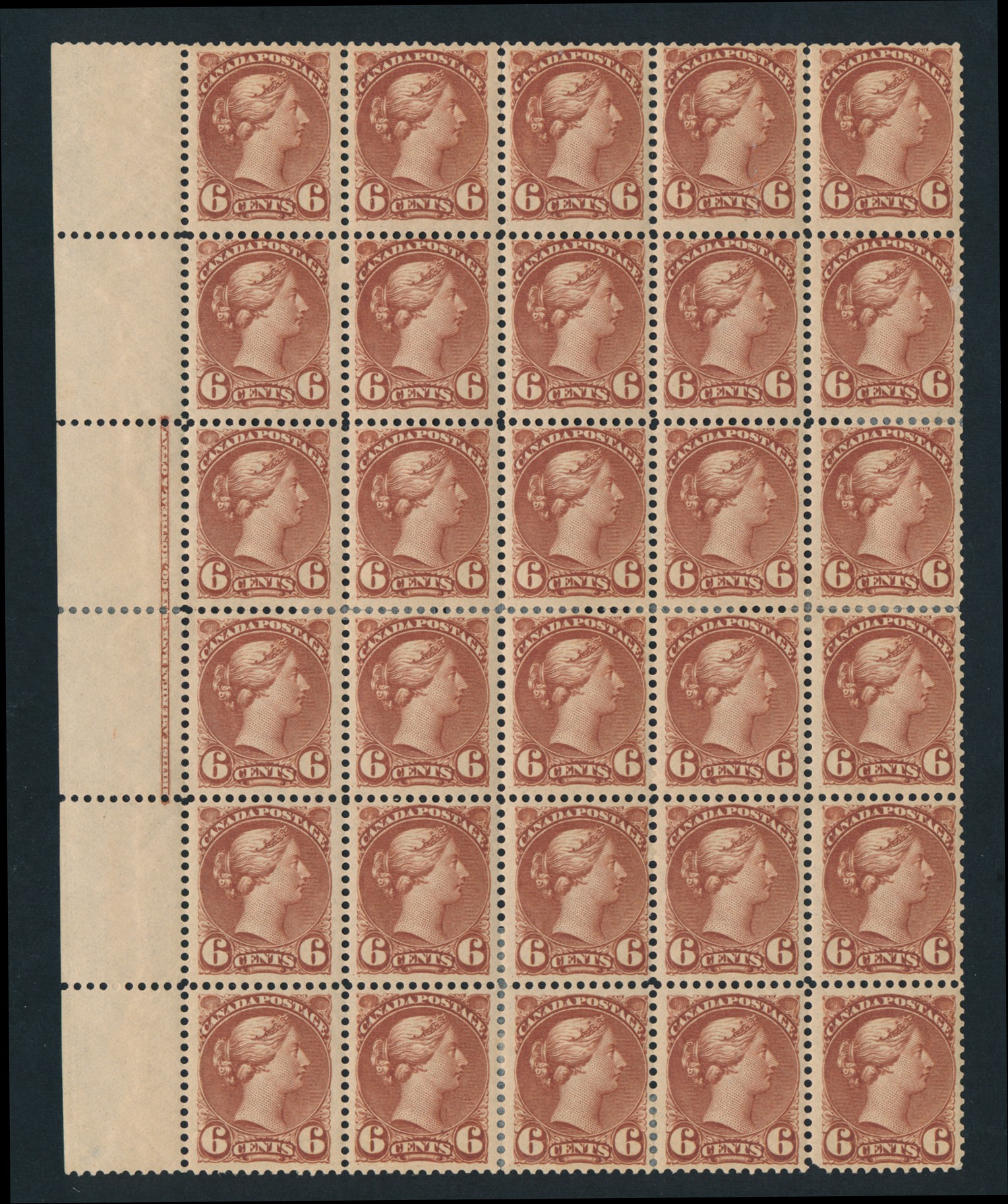 Lot 80 Canada #43 1890 6¢ red brown Small Queen block of thirty. A gorgeous and fresh, mint never hinged block (five by six) from centre of left sheet, showing full imprint in left selvedge. We note a particularly strong re-entry in position 24. Very fine as a block and with very light gum disturbance on seven stamps and small reinforcement between two stamps, all mentioned for the record. Worthy of the finest collection. Catalogued as twenty-three never hinged and seven hinged. Unitrade CV$22,800, Realized $8500