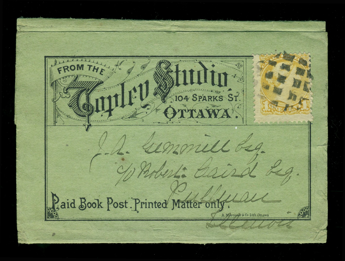 Canada #35 1¢ yellow Small Queen on lovely Topley Studio Illustrated wrapper, mailed from Ottawa to Illinois. Inscribed "Paid Book Post. Printed Matter only." Fine-very fine. Estimate $150, realized $316 including premium.