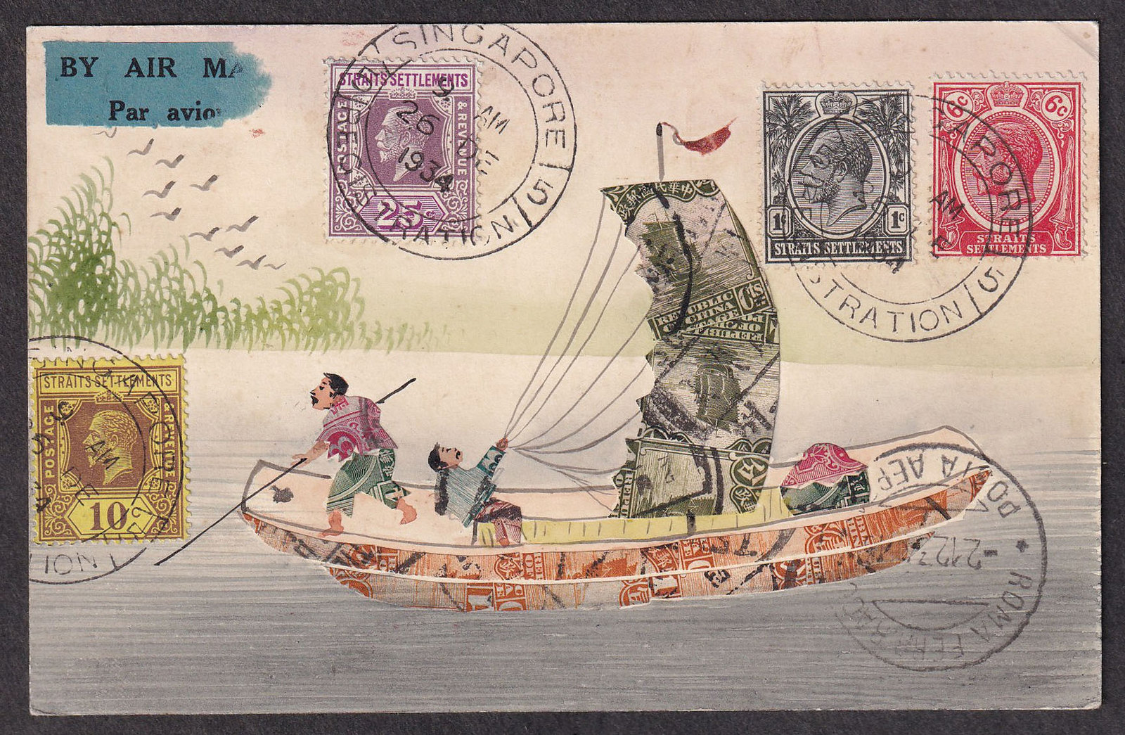 Lot 419 Malaya #179, 189, 191, 194. 1934 (December 25), hand-painted stamp art postcard to Switzerland, incorporating Chinese stamp fragments in a Junk design, franked with 1c black, 6c scarlet, 10c violet on yellow, and 25c red and red violet George V definitives of the Straits Settlements, tied by three strikes of “SINGAPORE REGISTRATION” c.d.s, front affixed with black on blue “BY AIR MAIL – PAR AVION” etiquette, second example on reverse alongside “Singapore R” registration label, and a violet “REGISTERED” handstamp, backstamped with “CHUR SWITZERLAND” (3 Jan 1935) double circle receiver, visually striking and unusual. (Sc. #179, 189, 191, 194) Sold for C$325.00 plus 17% buyer’s premium.