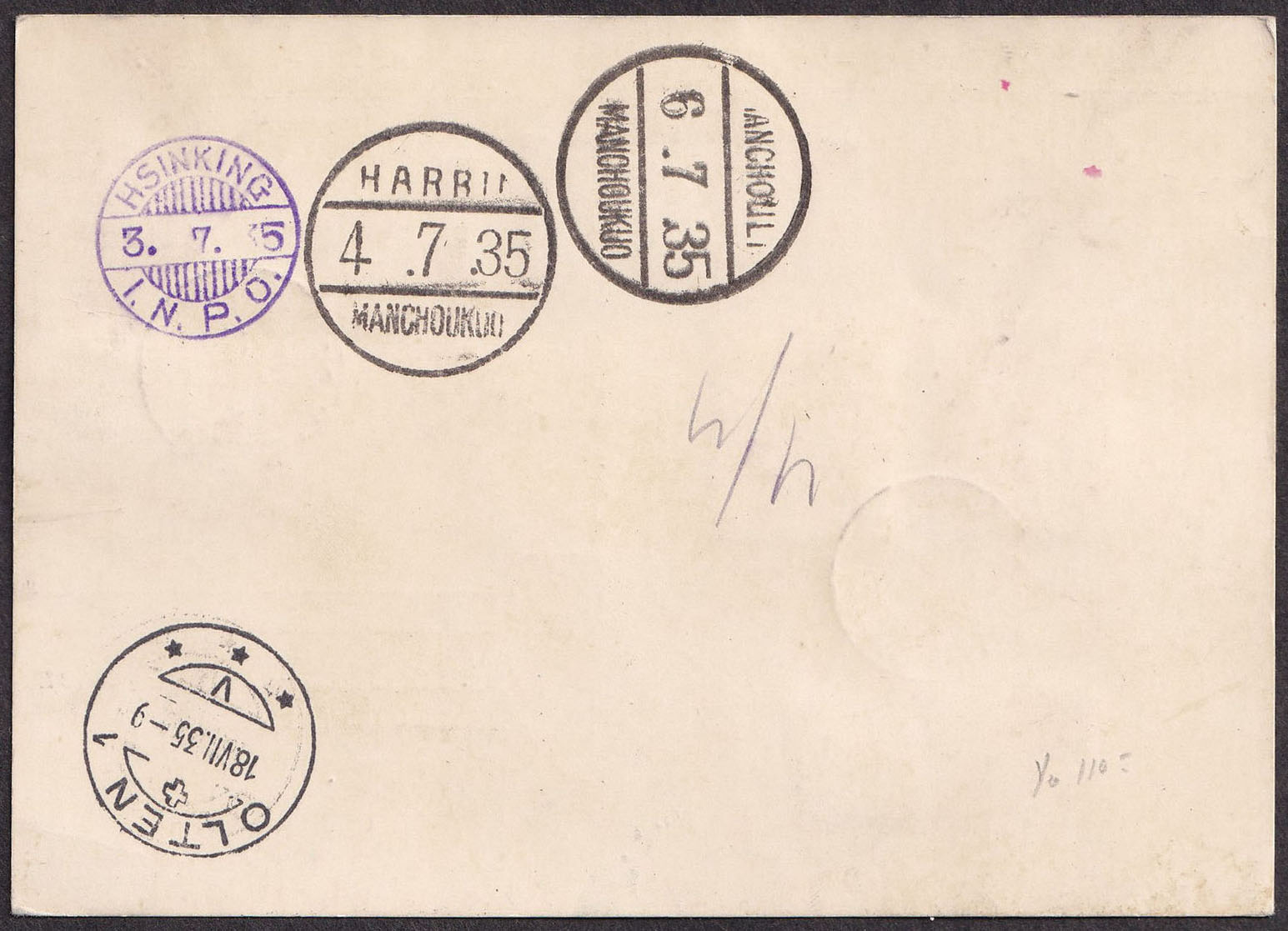 Lot 336 Japan #121, 172a, C3-C7. 1935 (June 29), registered airmail postal card from Tokyo to Switzerland, typed “Par avion; Tokio (crossed out) – Tschita – Moskau – Berlin – Zurich. Chargee,” franked with 5s violet definitive, 8s Mt. Fuji, and complete set of 8½s to 30s Passenger Plane over Lake Ashi airmail issues, tied by two “TOKIO NIPPON” double-circle cancellations, with blue bilingual “PAR AVION” airmail label and violet “TOKIO A” handstamp on blue-on-white airmail etiquette, with Basel Flugpost (18 Jul) double-circle receiver on front, and violet Hsingking (I.N.P.O.) (3 Jul), Harbin (4 Jul), and Manchoukuo (6 Jul) single-circle transits, Olten (18 Jul) double-circle receiver backstamp, very fine. (Sc. #121, 172a, C3/7). Sold for C$275.00 plus 17% buyer’s premium.