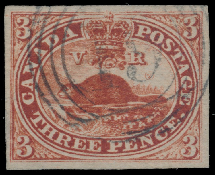 Lot 147 Canada #1iii 1851 3d Red Beaver Imperforate, on Laid Paper, with Major Re-Entry, used with light target cancel and clear laid lines, four clear to large margins, showing part of the next stamp at top, fine-very fine. This scarce stamp is from position A-47 and clearly shows doubling in several areas. Accompanied by a 1964 B.P.A. certificate. Rsv. $1,000. Unitrade CV$2,250.