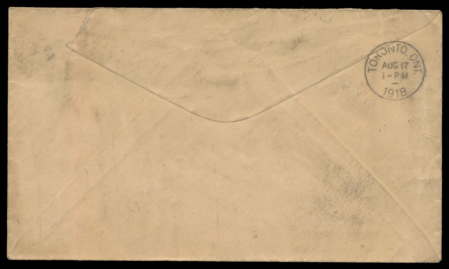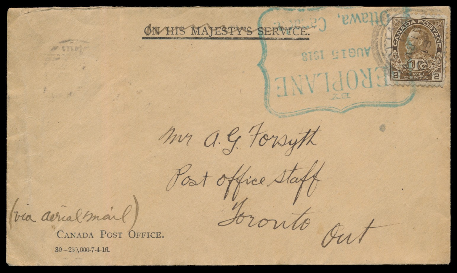Lot 673 Canada #PF-8a 1918 (August), Ottawa to Toronto, Pioneer Aerial Mail flight by Lt. Tremper Longman, franked with 2c Admiral War Tax, tied by Ottawa c.d.s. (15 Aug), further tied by bold green “BY / AEROPLANE / AUG 15 1918 / Ottawa, Canada flight cachet, endorsed in manuscript “via Aerial Mail” and addressed to A.G. Forsyth, with Toronto c.d.s. arrival backstamp (17 Aug), some uniform aging, but a lovely strike of this cachet, and a newly-discovered example of mail from this rare flight, of which only a handful of examples are recorded. Lt. Tremper Longman, RAF, flew a Curtiss JN-4 “Canuck” on behalf of the Aero Club of Canada, departing Leaside Aerodrome on August 15, and landing at Rockliffe Ranges, Ottawa, at 3:09pm the same day. He returned to Toronto on August 17, landing at Leaside at 12:25pm. Most mail carried on this flight was official correspondence; in the case of the cover offered here, “On His Majesty’s Service” is crossed-out. The letter was addressed to Mr. A.G. Forsyth, the former Mail Transportation Superintendent of Toronto, and has never before been offered on the philatelic market, having always been in the possession of Mr. Forsyth’s family. The family notes that Mr. Forsyth “was involved in the first airmail, and tested the delivery times by mailing letters to himself.” AAMC C$8,000.