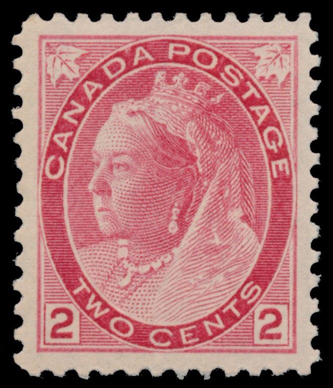 Lot 80 Canada #77a 1899, 2c carmine Numeral, Die II, never hinged, beautiful deep colour, superbly-centered, very fine; with 2023 Richard Gratton AIEP certificate. Unitrade CV$360.