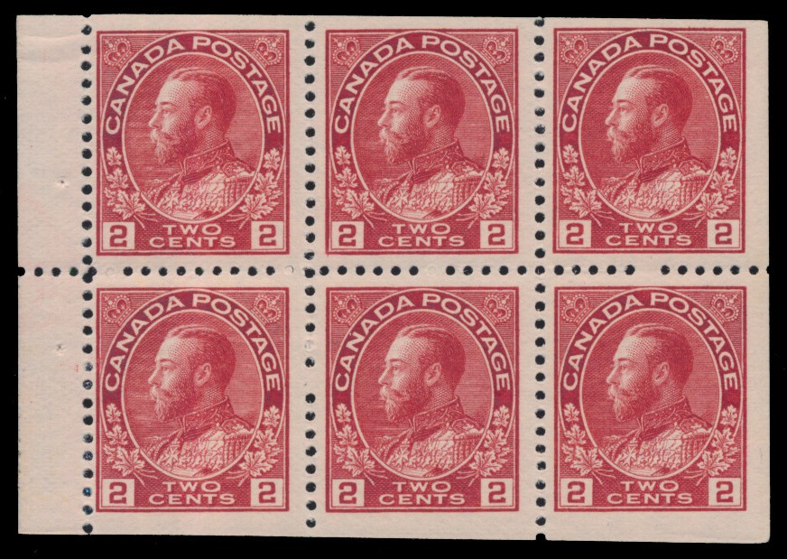 Lot 119 Canada #106aiii 1917-22, 2c carmine Admiral, squat printing, booklet pane of six, never hinged, the stamps being 18 x 21mm, the distinctive “squat printing,” scarce and very fine; with 2022 Richard Gratton AIEP certificate. Unitrade CV$700, sold for C$500.00 plus 17% buyer’s premium.