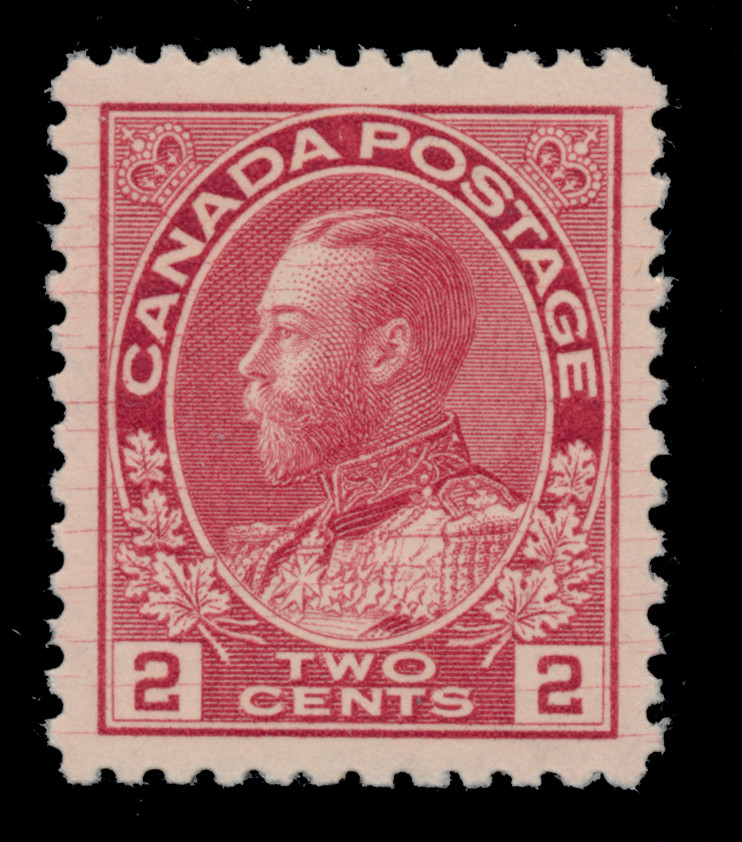 Lot 130 Canada #106ix 1912, 2c deep rose red Admiral, showing prominent horizontal “hairlines”, bright shade and precise centring, a beautiful example of this variety, rarely seen in this exceptional quality, extremely fine; with 2024 (XF-Sup 95) P.S.E. certificate. Unitrade CV$300, sold for C$425.00 plus 18% buyer’s premium.