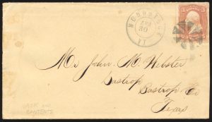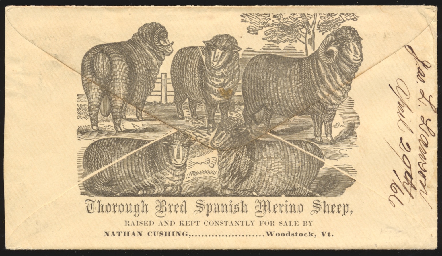 Lot 881 United States 1866 (April 30), illustrated Thorough Bred Spanish Merino Sheep cover and contents, to Bastrop, Texas, franked with 3c rose, Woodstock, Vermont segmented cork double circle cancel alongside, with corresponding c.d.s., the reverse and contents with lovely sheep illustrated advertising, a superb exhibit piece. (Sc. 65) Estimate C$150, sold for C$1,000.00 plus 17% buyer’s premium.